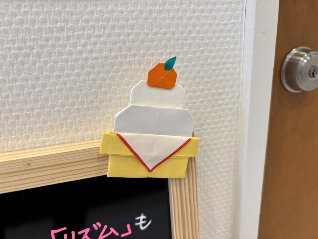↑恒例の折り紙は鏡餅と三方を作ってみました。今回はボードに貼り付けておりますが、立たせることもできます。